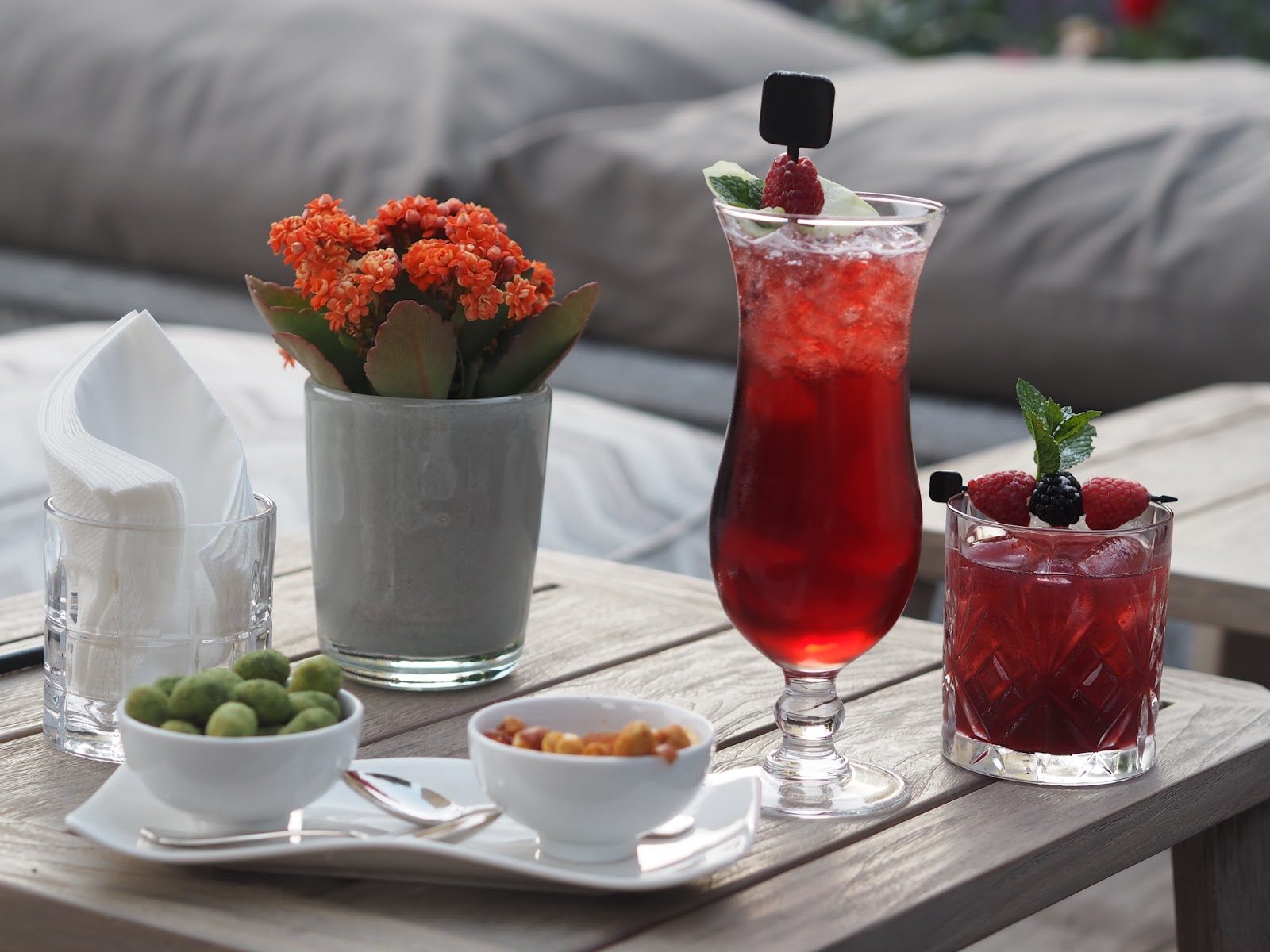 The evening started with cocktails on the hotel's beautiful terrace area, we enjoyed the berry infused Bellevue Smash made with Tanqueray Gin, Chambard, Raspberries, Blackberries and Lime juice as well as the refreshing home made Iced Tea while soaking in the dramatic views of the surrounding Alps.